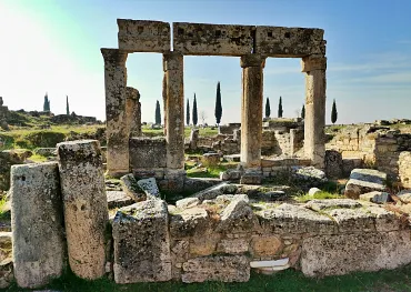 Then we continue our journey to Philadelphia, nowadays called Alasehir, another church of the Seven Churches of Asia [Rev. 1:11; 3:7], and the only church not censured. There we see the remains of a Byzantine basilica built of brick, with a bit of high arch and some 11th century frescoes. Continue to visit to Laodicia. The city established in the C3 BCE by the Seleucid Antiochus II, the city was named after his wife Laodicea. Built on the Lycus Tributary of the Meander River, it was surnamed Laodicea on Lycus, to distinguish it from other similarly named cities. Laodicia is the last of the seven churches. As a crossroad of two important roads, this city had an important commercial and logistical position. We drive to the healing city of Hierapolis, actually Pamukkale, the white «cotton fortress» where hot mineral water bursts from the earth and cascades over steep cliffs forming pools, channels and stalactites. The therapeutic waters were known to the founders of Hierapolis and of Laodicea in 190 BC. Check in at hotel for dinner and overnight in a Thermal Hotel.