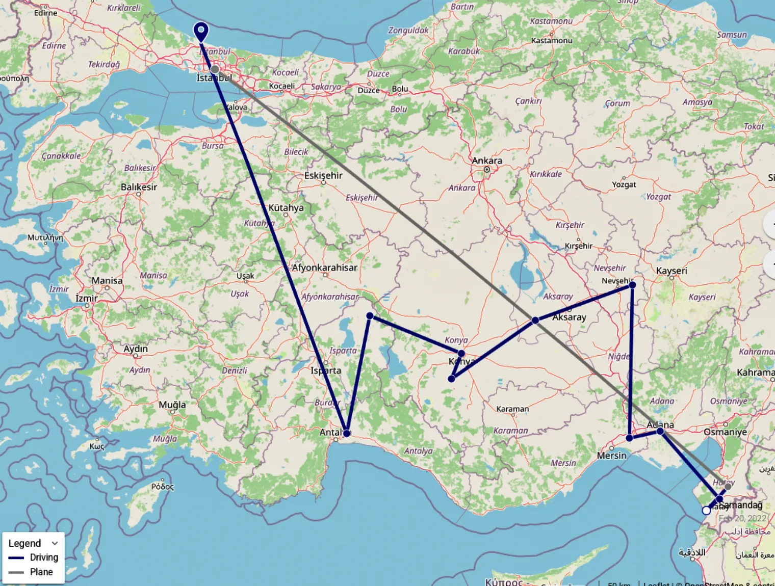 Paul, Barnabas and Joh Mark started their first missionary journey in about 45 A.D from Antioch and travelled to the port at Selecia Pieria to set sail to Cyprus. They sailed from Cyprus to Perga and travalled to Psidian Antioch, Iconium, Lystra and Derbe and returned to Antioch.